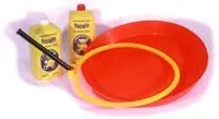 Das Set für die Riesenseifenblasen - bestehend aus einem Teller mit dazugehörigem Ring mit 35cm Durchmesser und zwei Litern Pustefixflüssigkeit.